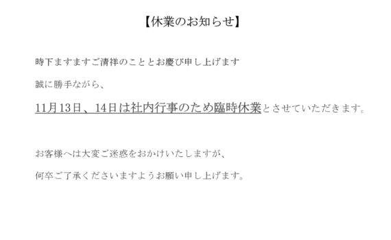 誠に勝手ながら、8月10日(土)~8月18(日)まで夏季休業させて頂きます。